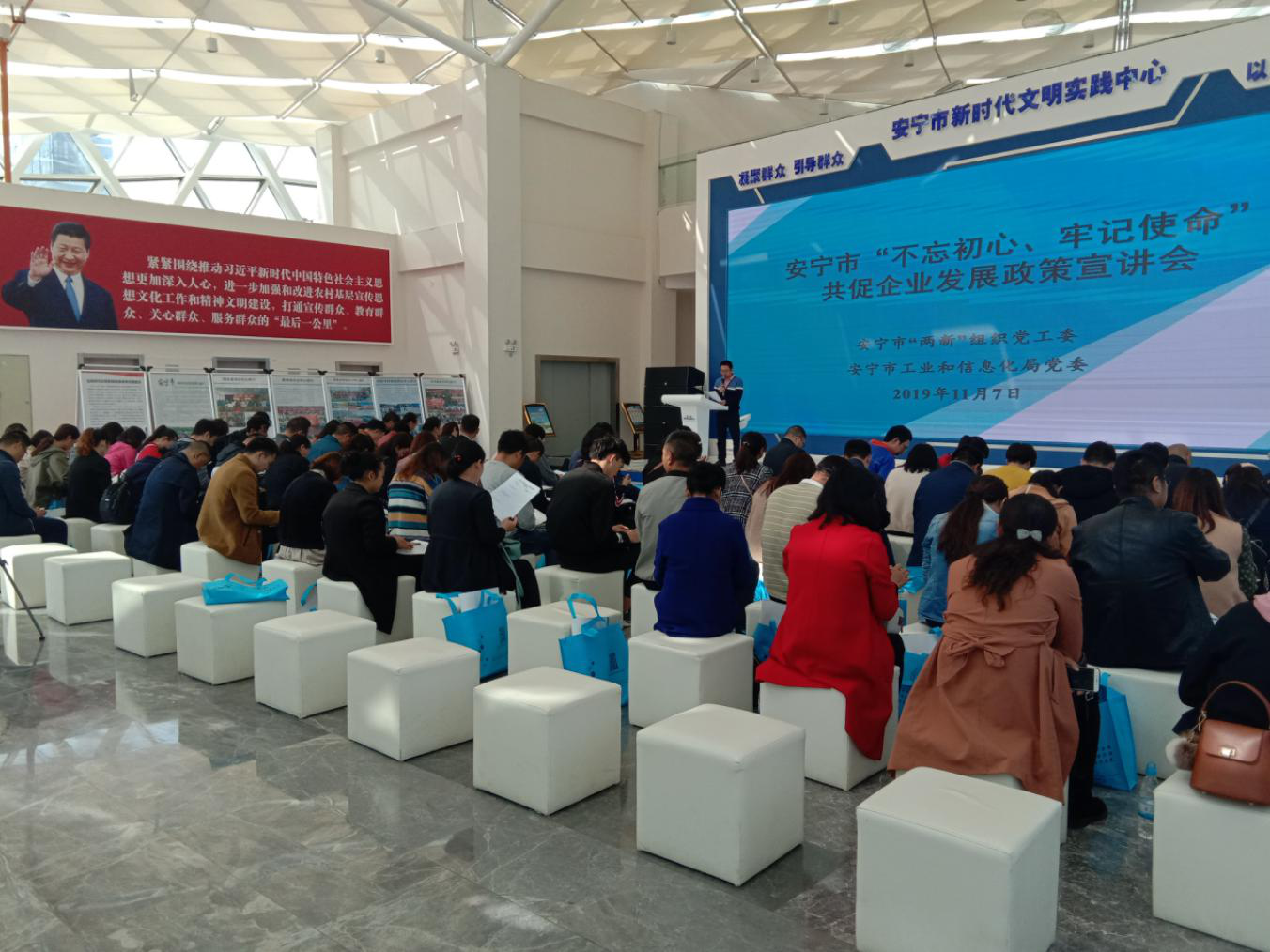 2019117 ,安寧市“兩新”組織黨工委、安寧市工業(yè)和信息化局主辦, 昆明國際石化磷化產(chǎn)業(yè)集群公共服務(wù)窗口平臺協(xié)辦的“不忘初心、牢記使命”共促企業(yè)發(fā)展政策宣講座談會在安寧市新時(shí)代文明實(shí)踐中心小云端廳成功舉辦。安寧市域50家規(guī)上企業(yè)負(fù)責(zé)人代表、40家中小企業(yè)負(fù)責(zé)人代表、通訊三大運(yùn)營商負(fù)責(zé)人、工信局黨委所轄17家非公黨支部書記、昆明國際石化磷化產(chǎn)業(yè)集群公共服務(wù)窗口平臺負(fù)責(zé)人共100多人參加此次會議。