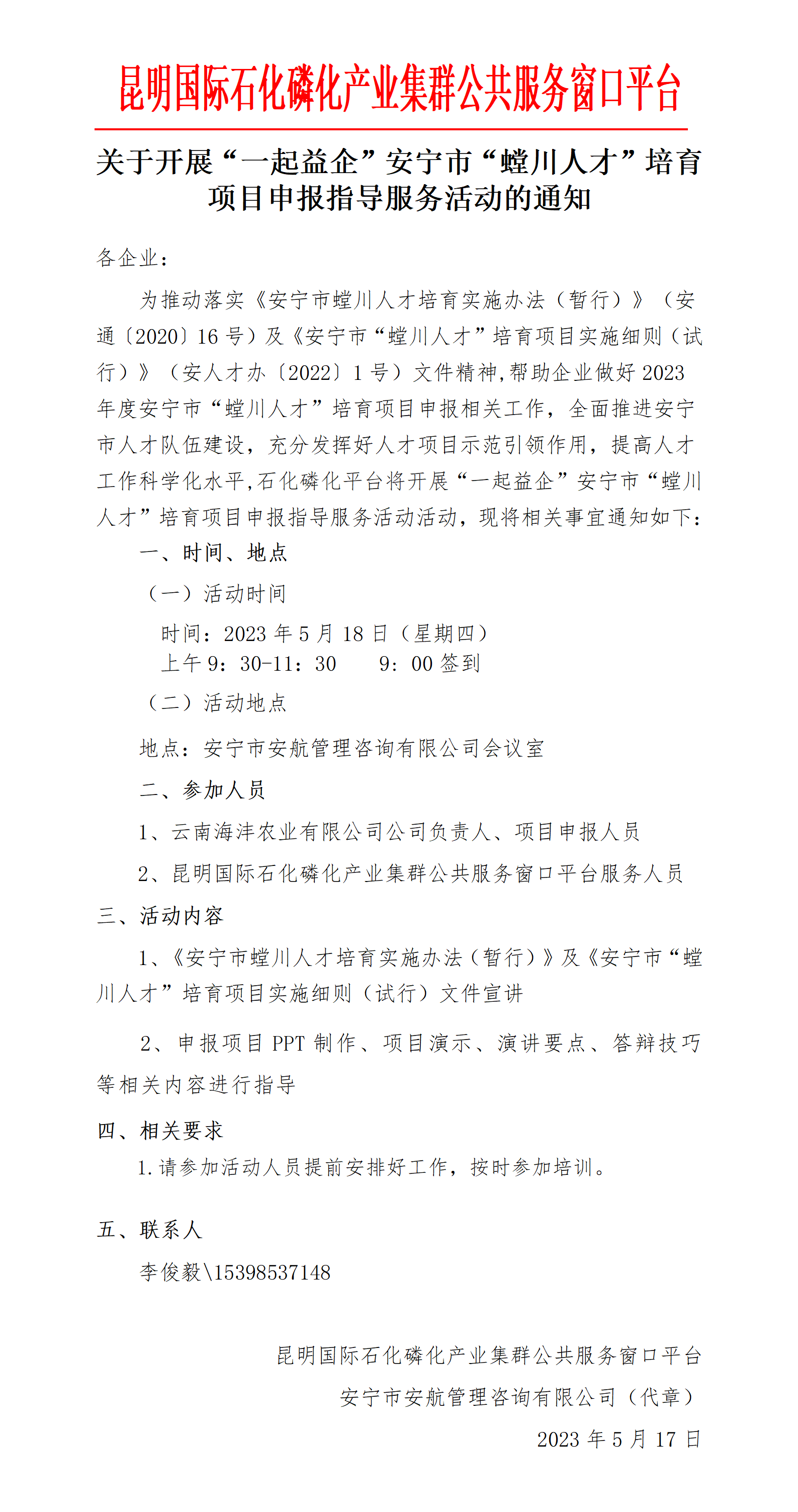 關(guān)于開展“一起益企”安寧市“螳川人才”培育項目申報指導服務(wù)活動的通知