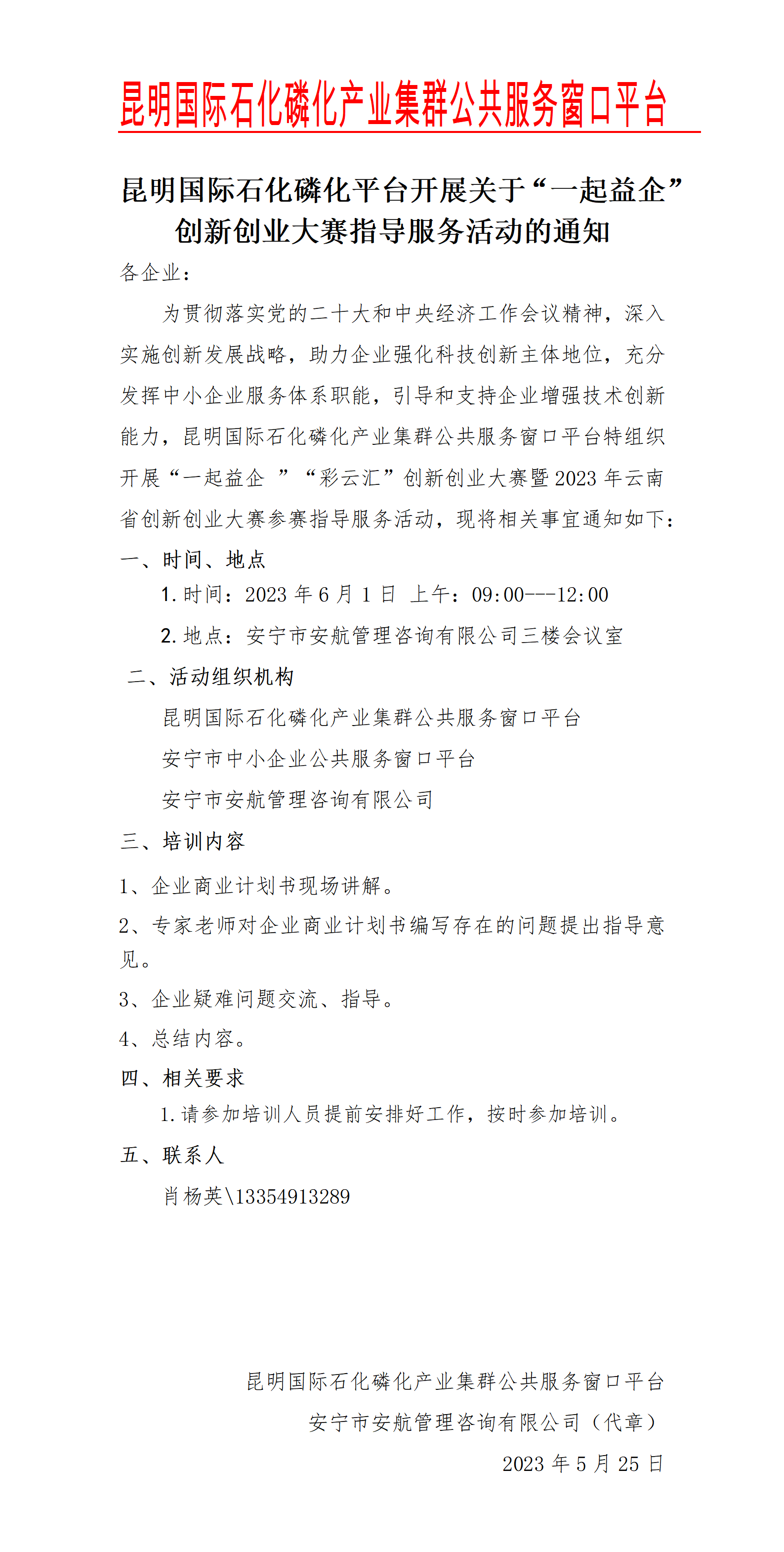昆明國際石化磷化平臺開展關于“一起益企”創(chuàng)新創(chuàng)業(yè)大賽指導服務活動的通知