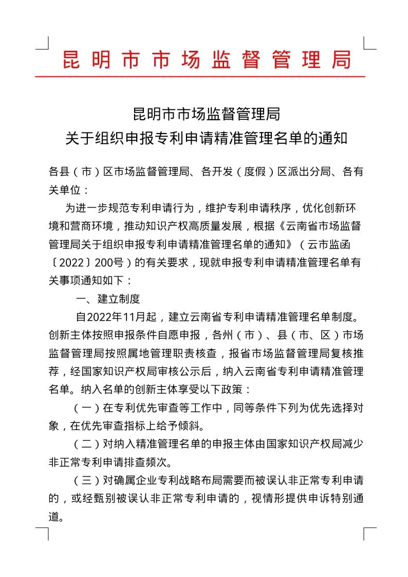 昆明市市場監(jiān)督管理局關(guān)于組織申報(bào)專利申請(qǐng)精準(zhǔn)管理名單的通知
